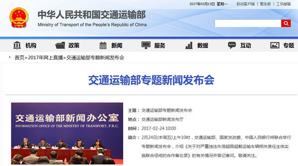 2017年2月24日上午10時(shí),交通運(yùn)輸部舉行了本年度第一次例行新聞發(fā)布會(huì),本次專題發(fā)布會(huì)由交通運(yùn)輸部、國(guó)家發(fā)改委、中國(guó)人民銀行聯(lián)合舉行,介紹《關(guān)于對(duì)嚴(yán)重違法失信超限超載運(yùn)輸車輛相關(guān)責(zé)任主體實(shí)施聯(lián)合懲戒的合...